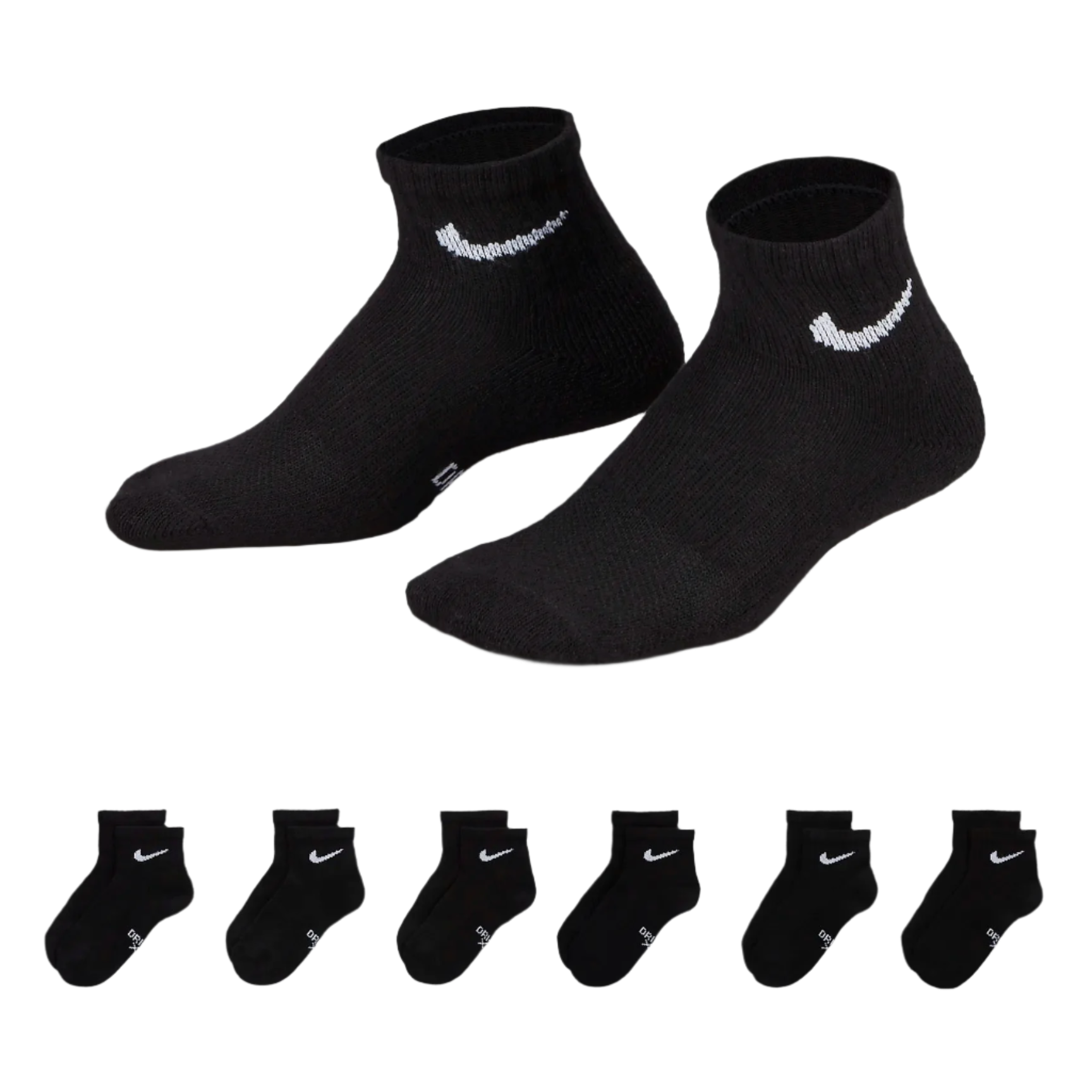 Supportive footwear begins with what's inside your kid's shoes, and these socks provide lots of support while putting the focus on their Nikes. They have a breathable mesh upper, the ribbed arch support band helps with balance, to prevent or relieve pain and comfy cushioning at the bottom, heel and toe helps absorb impact during every run, jump and skip while Dri-FIT technology wicks away moisture from skin and is quick drying to help keep feet cool and dry during play.