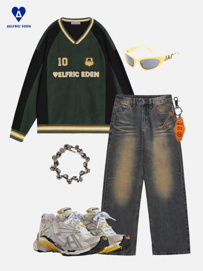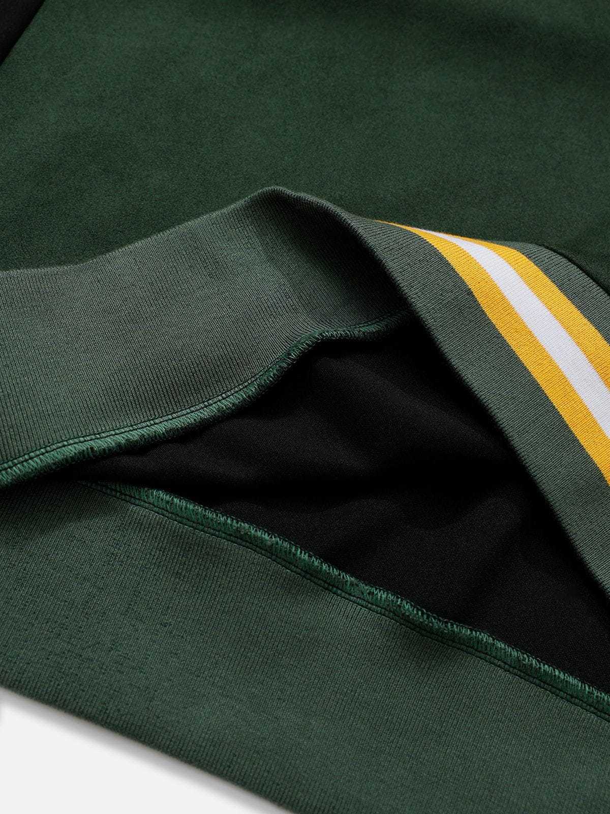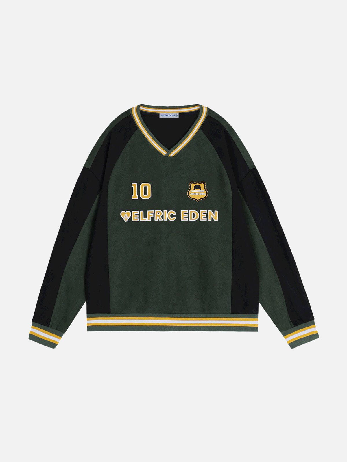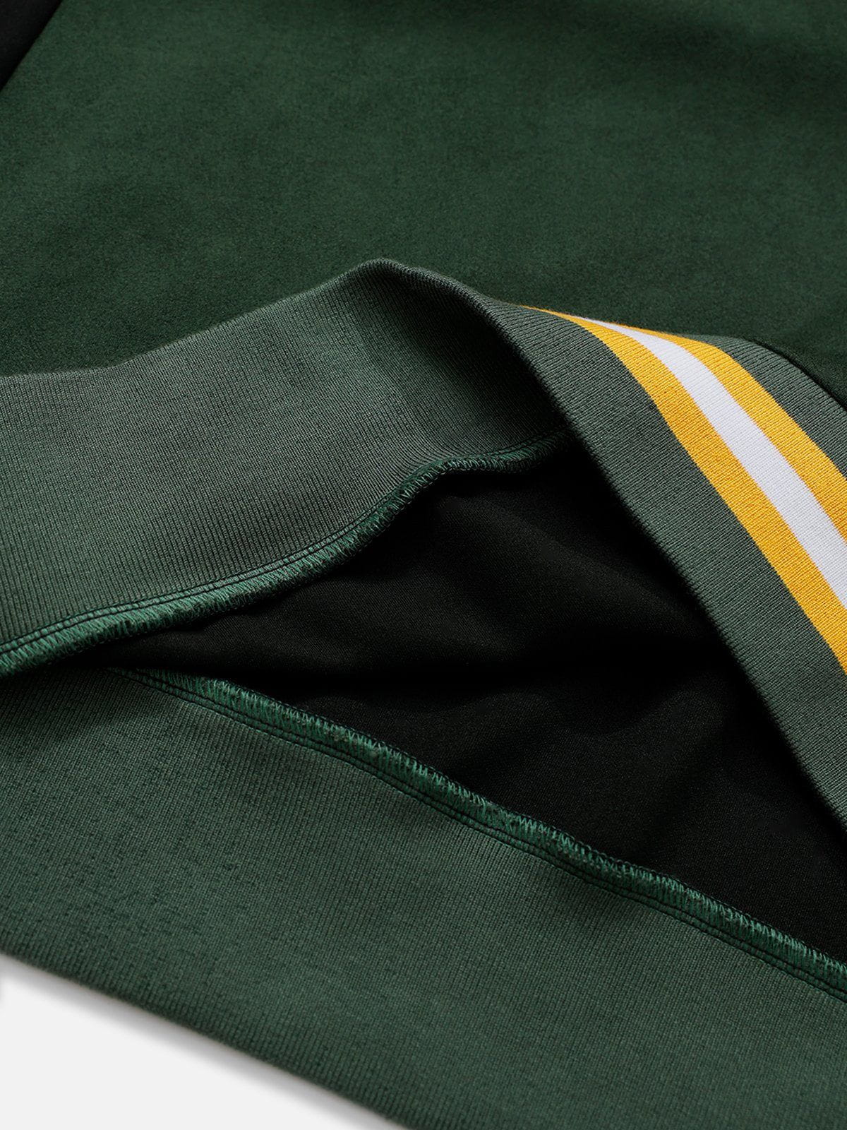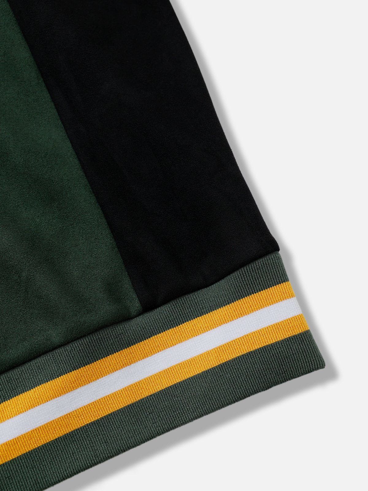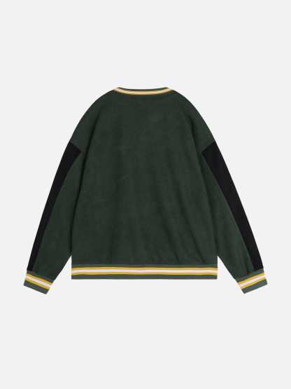This sweatshirt features a bold color-blocking design with contrasting green and black tones, complemented by embroidered details for added texture and style. Crafted from soft suede fabric, it offers a luxurious feel and a relaxed fit.